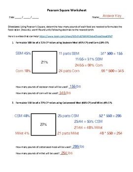Pearson Square Worksheet Answer Key. Formulating rations for a single nutrient by blending two different feeds. Formulate 500 lbs of a 21% cp ration using soybean meal (44% cp) and corn (9% cp).